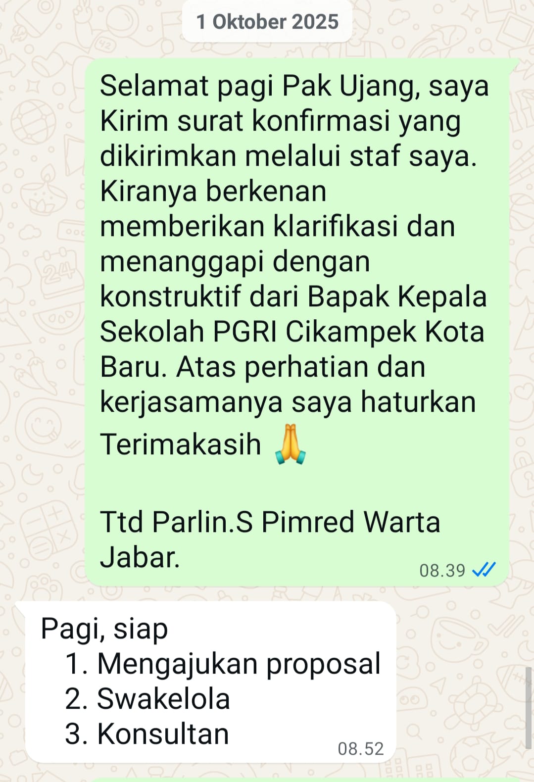 Foto: Pesan singkat WhatsApp dari Kepala Sekolah SMA PLUS PGRI Cikampek kepada Redaksi Warta Jabar.