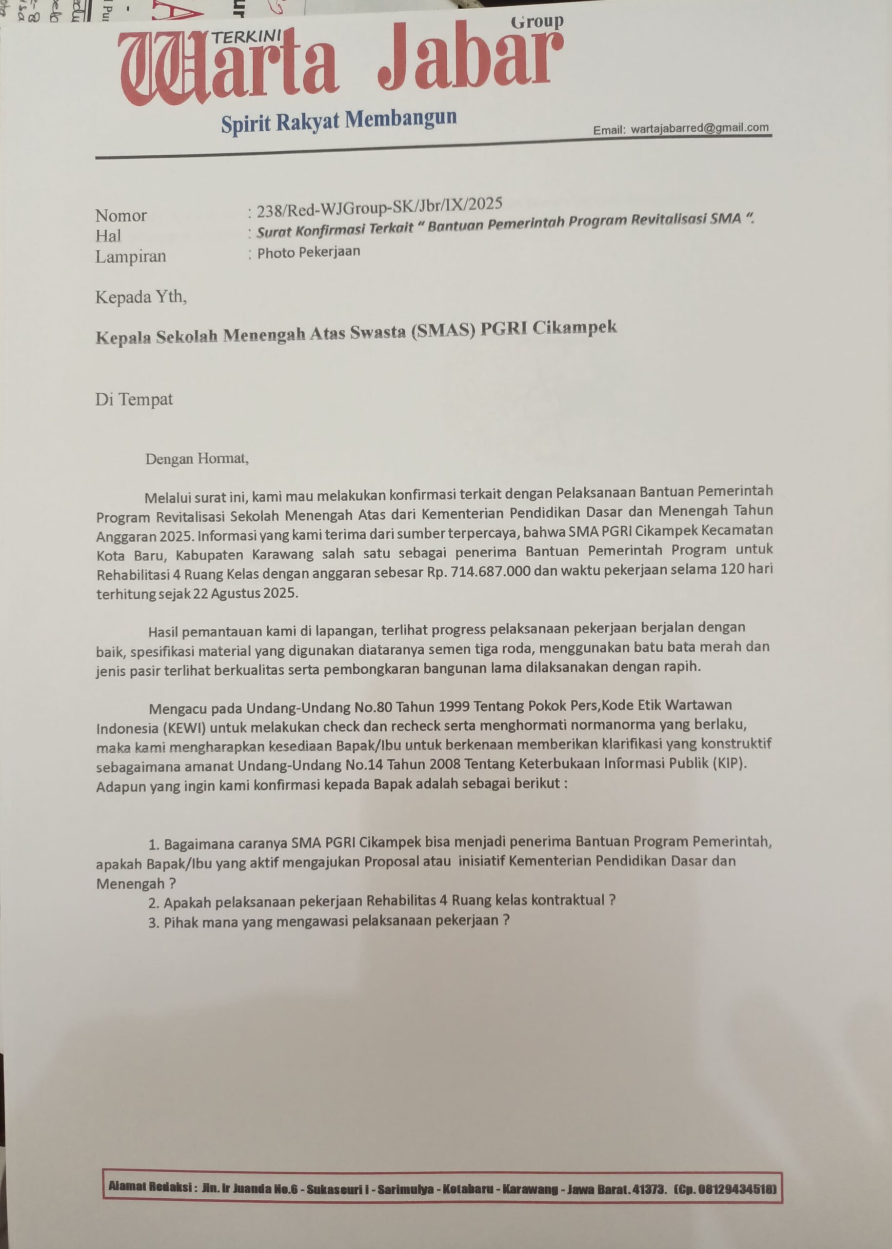 Karawang – Wartajabar.Online | Rupanya, keterbukaan informasi publik belum juga sampai ke gerbang SMA PLUS PGRI Cikampek. Upaya konfirmasi yang dilakukan redaksi Warta Jabar terkait kegiatan rehabilitasi dan pembangunan ruang kelas baru di sekolah tersebut justru seolah terbentur tembok tebal bernama “tidak berada di tempat”.